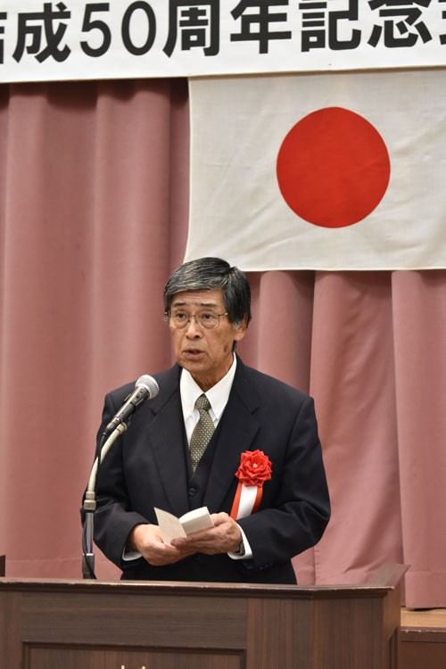 [写真/記念式典で式辞を述べる丹羽会長 ]