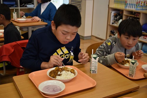 [写真/シーフードカレーを?張る町立庶路学園の児童 ]