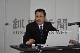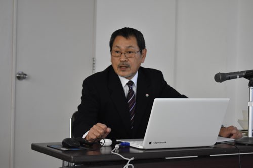 [写真/今年8月に行った国後島への自由訪問での体験を語る堀江氏 ]