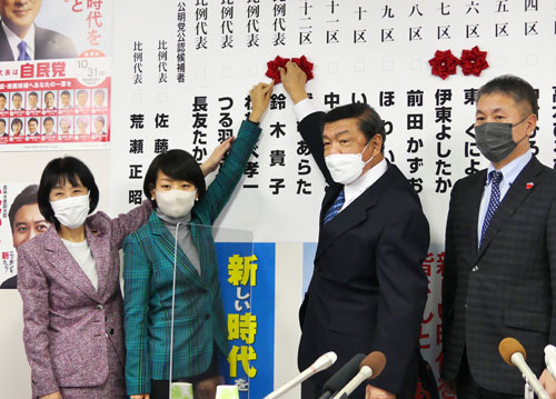 [写真/当選確実となり自民党道連の選対本部の名簿に花を付ける伊東氏と鈴木氏(右から2、3人目)=10月31日午後8時2分、札幌市中央区]