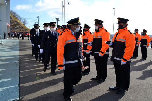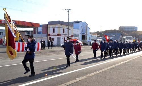 浜中消防団(渡部健団長)は7日に行い、団員81人が松本博町長ら来賓が見守る中、町総合文化センター前から消防庁舎まで分列行進し統率のとれた隊列を披露した。
