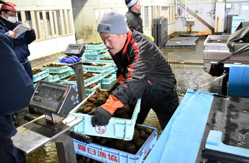 荷揚げされたウニは、殻付きで入札が行われ、水揚げ量は約2・5㌧、浜値は1㌔当たり1292~5692円の値が付き、好調な滑り出しとなった。
