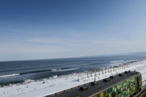 網走を出発すると網走市の観光ガイドによる名調子が始まります。進行方向左側には、オホーツク海が広がります。ドアが閉まり、発車ブザーが鳴り、網走を出発して車掌さんの案内、そしてガイドによる車内放送が始まります。音だけをお聞ききいただき、頭の中で車窓をイメージしてくださいね。