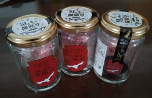 サボやエンブレム、マスク&マスクケース、ステッカーに加え、新商品として「SL金太郎飴」が新登場しました。ヘッドマークが金太郎飴になっていてて、ビンの中にはオリジナル缶バッジ(3種類あります)も入っています。そのほかプリンや釧路の地酒「福司」ワンカップ、MR.ししゃも、クッキーなども販売しています。販売カウンターは、釧路発の湿原号は標茶少し手前まで、標茶発は塘路まで営業しています。