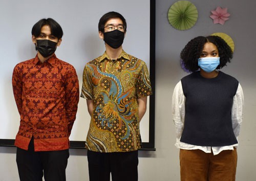 続いてウィジャヤさんは、釧路高専3年の後輩イマム・カイリ・ルビスさんを連れて登場。人口2億7000万人で34州もあるインドネシアについて、1400の民族が仲良く暮らす平和の国だと強調。種類が豊富なランの花、果実ドリアン、6大宗教、伝統衣装などの写真を見せながら解説。辛さを好む民族の特徴や名所なども紹介した。「暑さはどのくらい」の質問に「赤道直下で28~37度が年間気温。でも湿度が低いので大丈夫」と答えていた。
