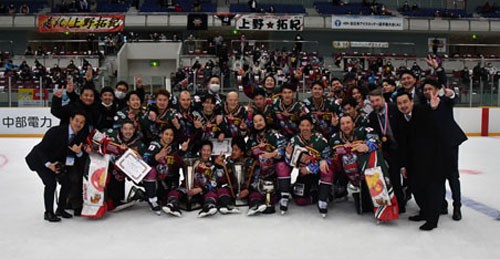 連覇が懸かった全日本選手権(12月16~19日、長野県)では、日本製紙時代からの伝統といえる短期決戦・トーナメント戦での強さを発揮。1回戦で社会人チームの日本製鉄室蘭に圧勝。準決勝でアイスバックスを延長、ゲームウイニングショット(GWS)の末に撃破。決勝では東北フリーブレイズに逆転勝利を収め、大会連覇を成し遂げた。最優秀選手賞に輝いた大津晃介副主将(28)は「優勝したぞ!」と、テレビ観戦するファンらに届けとばかりにトロフィーを掲げた。集合写真には選手、スタッフ、田中代表も輪に入り、喜びを分かち合った。