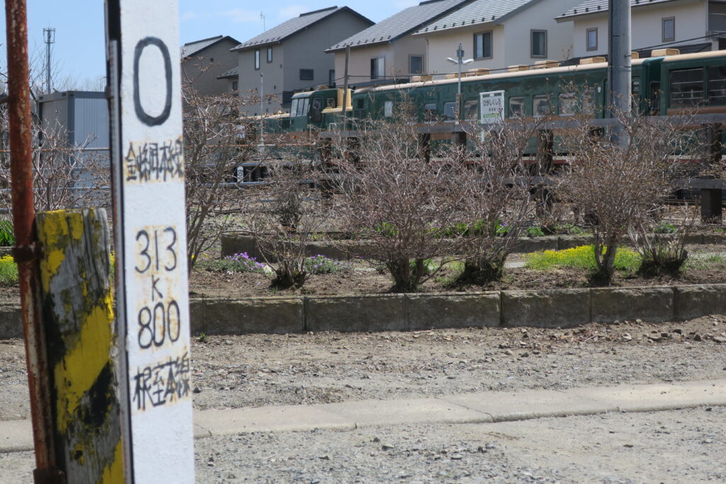 東釧路駅にある釧網本線のゼロキロポストとノロッコ号(2022年4月30日撮影)