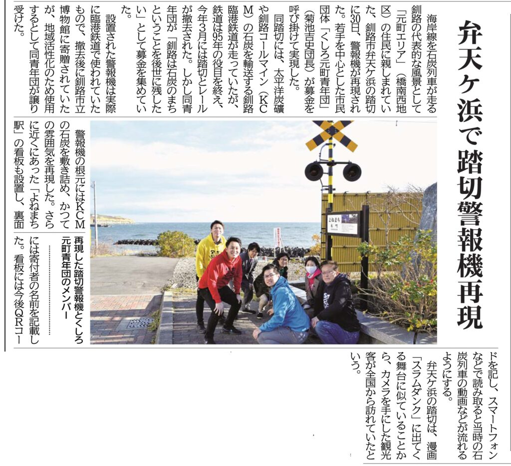 釧路市内の市民団体「くしろ元町青年団」は、石炭列車の記憶を後世に残したいと、廃止後一度は撤去された弁天ヶ浜にあった踏切を再現しました。その模様は、2020年10月31日付の釧路新聞に掲載されています。