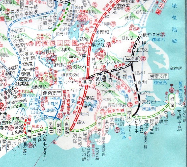 1965(昭和40)年ころの釧路、根室地方の鉄道。尺別鉄道や浜中町営軌道、標茶町営軌道、別海町営軌道などがなぜか記載されていません(「国鉄職員用 レクレーション全国旅行案内書」から)