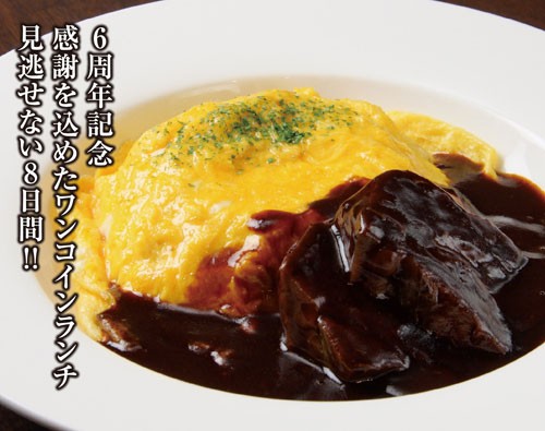 イオンシネマへの通路沿いにあるプチ・ルポではオープン6周年を記念し、コストを度外視(笑)、コスパ最高の超お得なワンコインランチを期間限定で提供します!メニューのビーフシチューオムライスは、その名の通り「オムライス」と「ビーフシチュー」を一度に味わえるとびきり贅沢なひと皿! ふわとろでまろやかな卵のオムライスと、6時間じっくり煮込みお肉が柔らかくとろける濃厚でコク深いシチューが重なり合い、最後のひと口までじっくりと味わいたくなるおいしさです。これはもう行くしかない!!