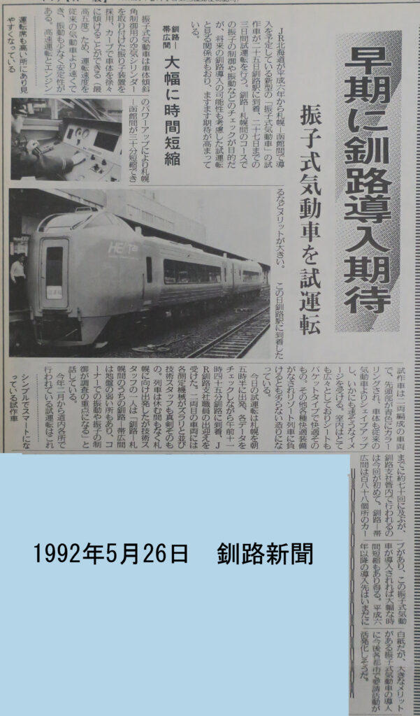 キハ281系試運転の釧路到着を伝える釧路新聞(1992年5月26日付)