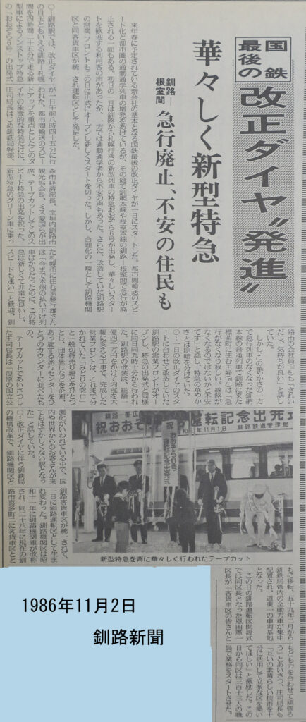 キハ183系500、1500番台の出発を伝える釧路新聞(1986年11月2日付)