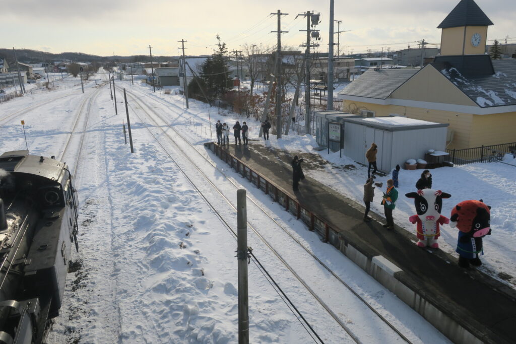 標茶を出発して釧路へ向かいSL冬の湿原号に向かって、標茶のみなさんが手を振ってくれます。車内のお客さんと心の触れ合いがいいですね。思い出に残ります。