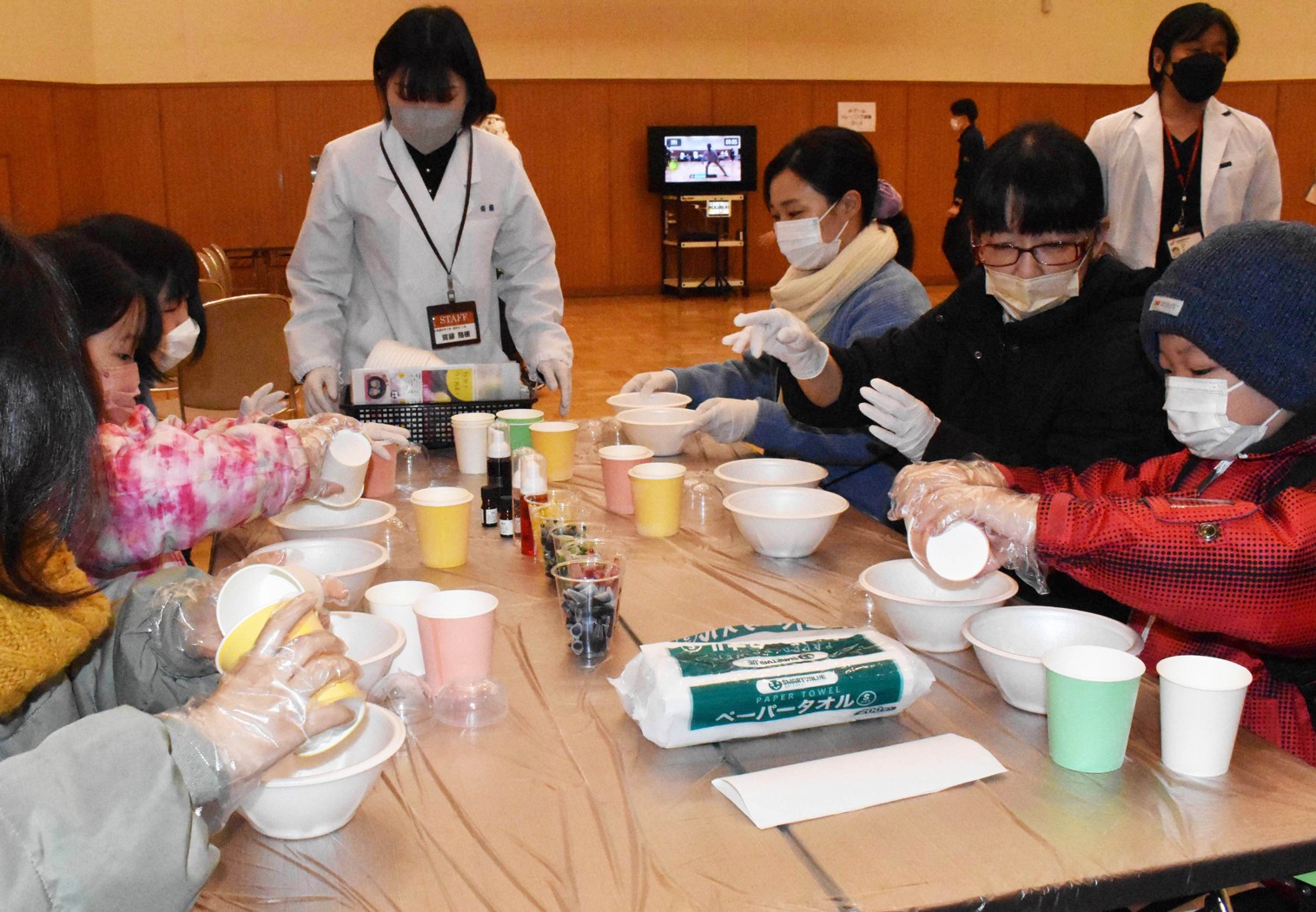 新聞でスリップや食器 親子ら災害に備え作製 くしろ消費者まつり_1(2023-02-12)