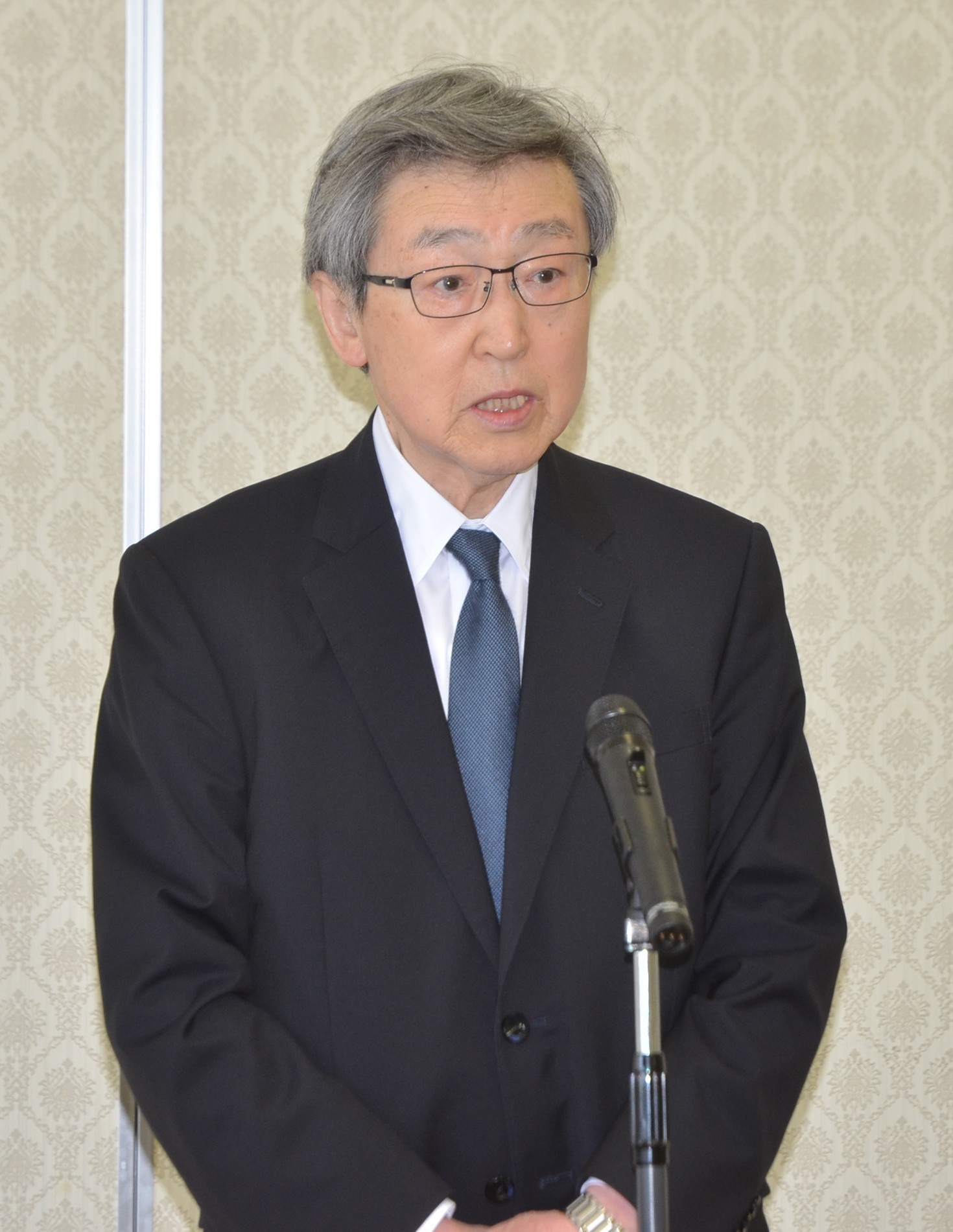 [写真/協議会の初会合に臨む竹森会長(中央)、加藤校長(右)、岩原勝行教育長 ]