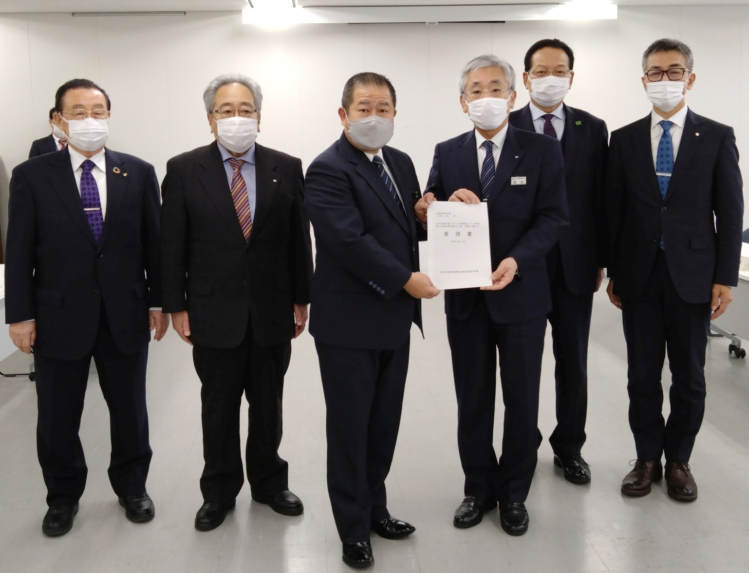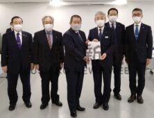 [写真/石垣市長(右)に反射板を託す荒木会長(左)ら ]