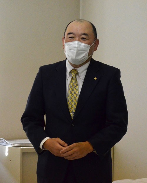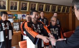 [写真/寄付金を手渡す浅野目会長(右) ]