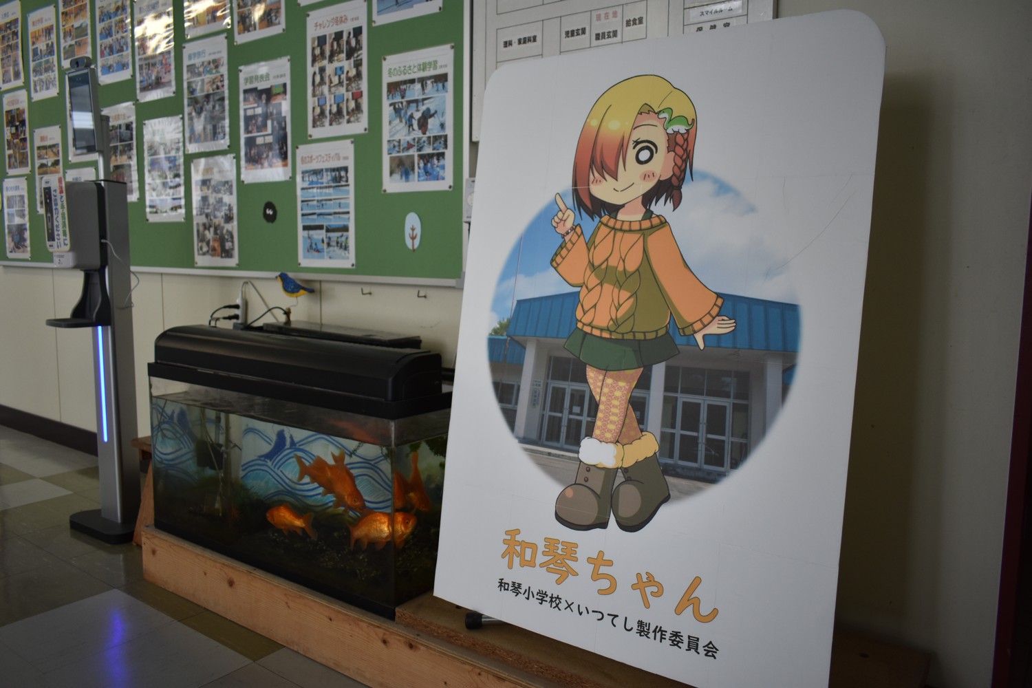 著作権を同製作委と共有する同校では、公式X(旧ツイッター)のアイコンや学校便りに和琴ちゃんのイラストを使用しているほか、昨年12月にパネルを自作し、玄関に設置した。大山校長は「雰囲気が良く、違和感がないデザイン。クッシーの髪飾りがかわいらしい」とにっこり。児童たちからも好評という。