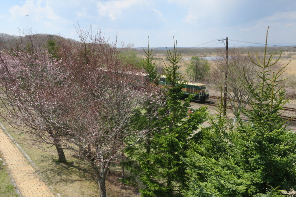 少しだけ咲いたサクラを横目に遠矢を通過するくしろ湿原ノロッコ号