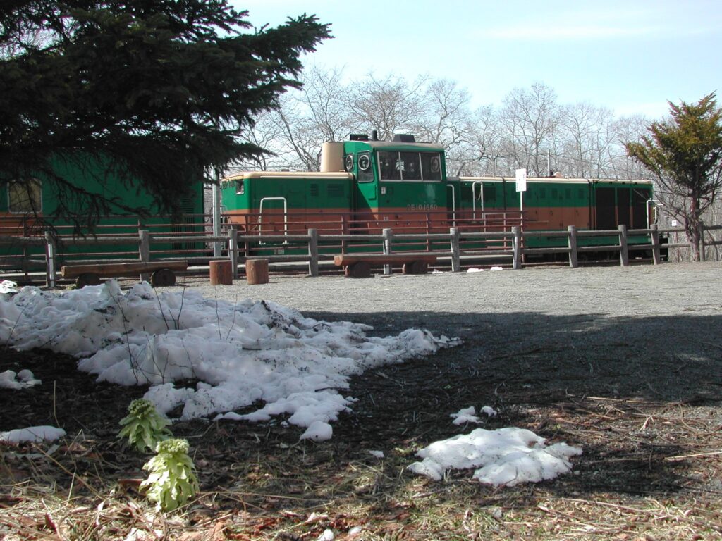 まだ雪の残る釧路湿原駅に到着したノロッコ号(2009年4月)