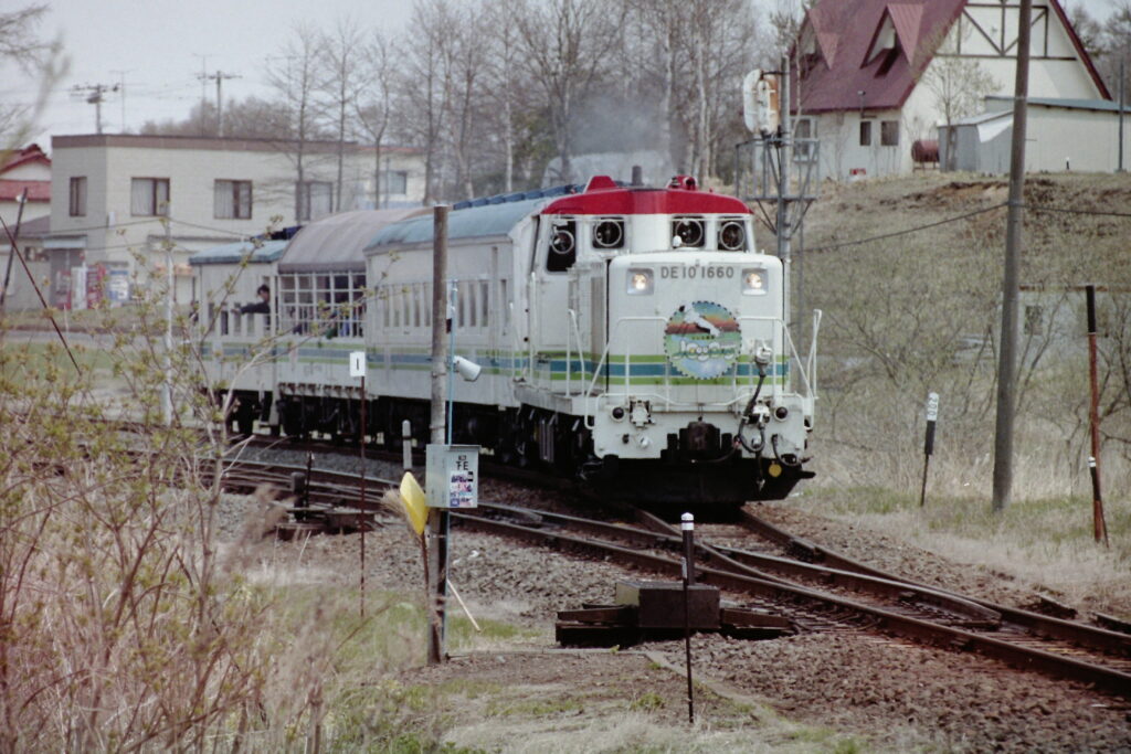 登場当時の旧ノロッコ号、塘路駅で機関車を付け替え釧路駅へ(1997年6月)