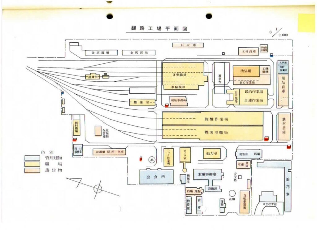 車両修繕の機能的な配置になっていた国鉄釧路工場(1966年の平面図)