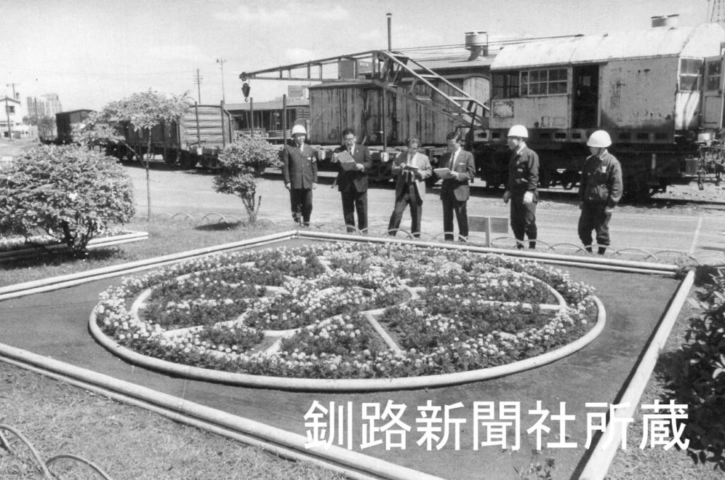 国鉄釧路工場の職場花壇コンクール審査会(1971年 後ろの車両が気になりますね)