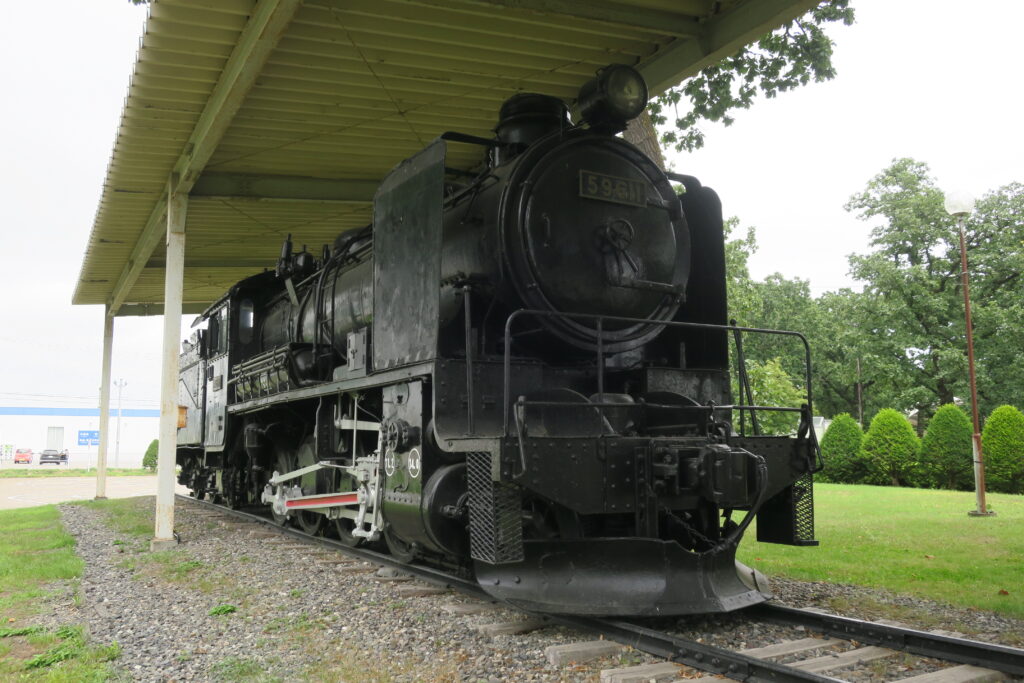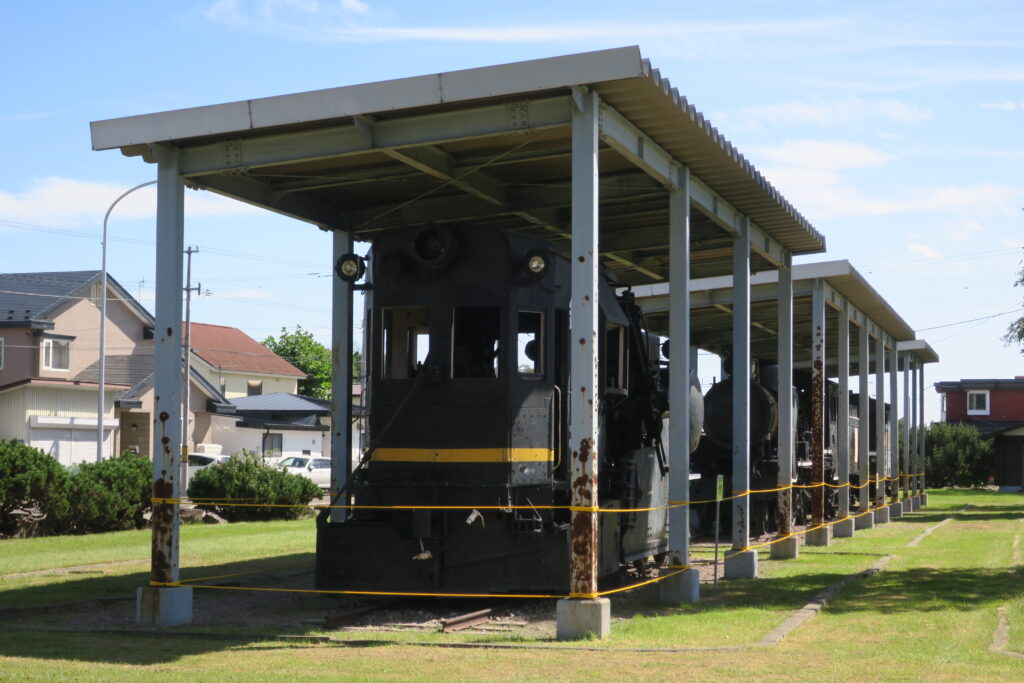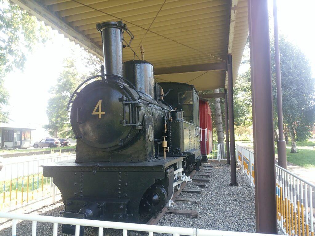 とてっぽ通に保存されている十勝鉄道の蒸気機関車4号・客車コハ23号