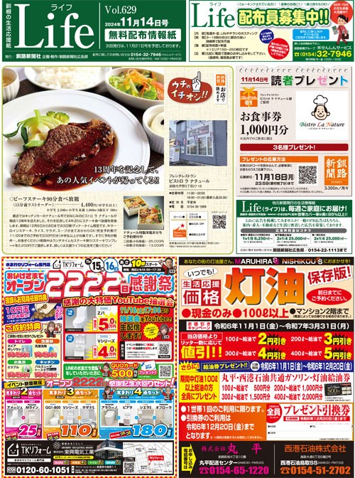 最近ではキッチンカーのナチュール号でおなじみのビストロ ラ ナチュールが開店13周年を迎えました。それを記念して4年ぶりにステーキ食べ放題を実施します。期間は12月6日から8日までの3日間!ディナータイム限定です。牛サーロインステーキ、ライス、サラダ、スープが全ておかわりOK!完全予約制で11/20までのご予約で200円引き(中学生以上が対象です)。すでに予約が数件…。お急ぎください!期間中はランチタイムもステーキ祭り!ステーキワンプレートを2,200円でご提供します。詳しくは次週ライフの広告をご覧ください!