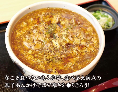 寒い日が続いていましたがついに釧路もまとまった雪が降ってしまい、冬本番となりましたね。そんな季節に食べたくなるのはやはりアツアツのメニューという事で、今回はそば処蒼(あおい)の親子あんかけそばをご紹介。