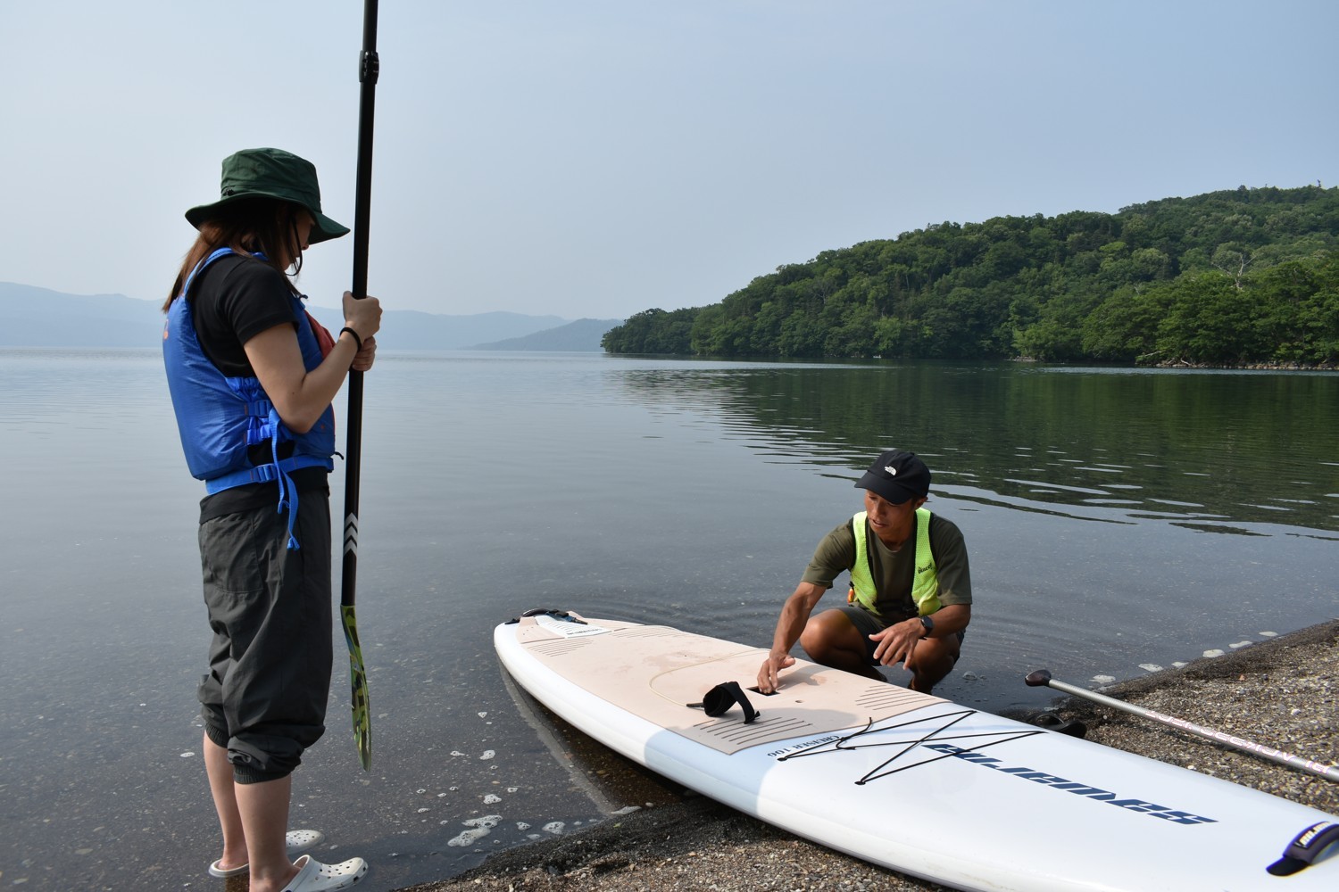[写真/SUPの乗り方についてインストラクター(右)からレクチャーを受ける初心者の女性。「見よう見まね」は厳禁だ(17日)]