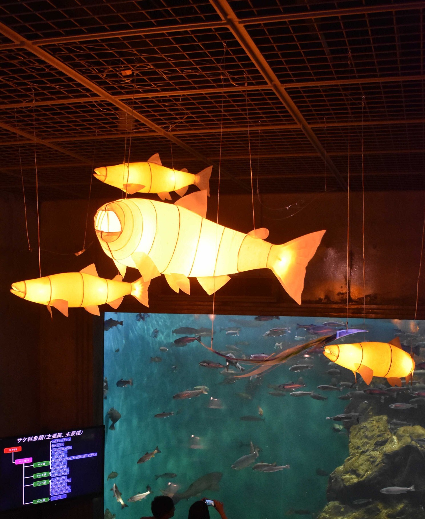 [写真/1階海水大水槽前で展示している躍動感ある鮭ちょうちん4体]