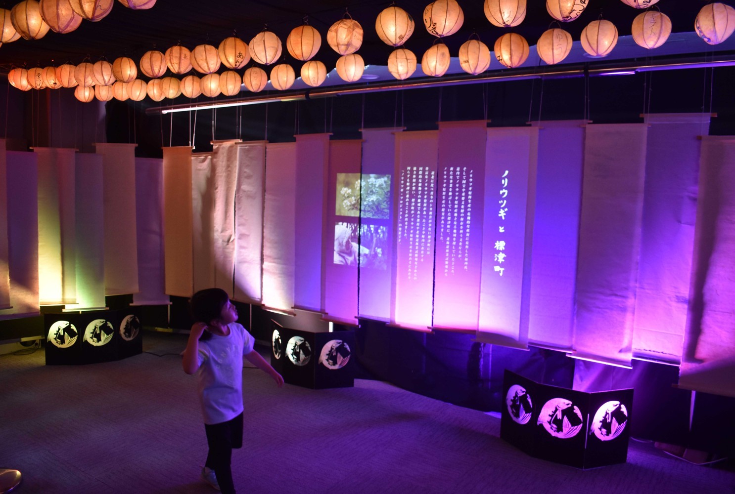 [写真/天井にいくらちょうちんを設置し、草木染めをした和紙を展示している2階展示室]