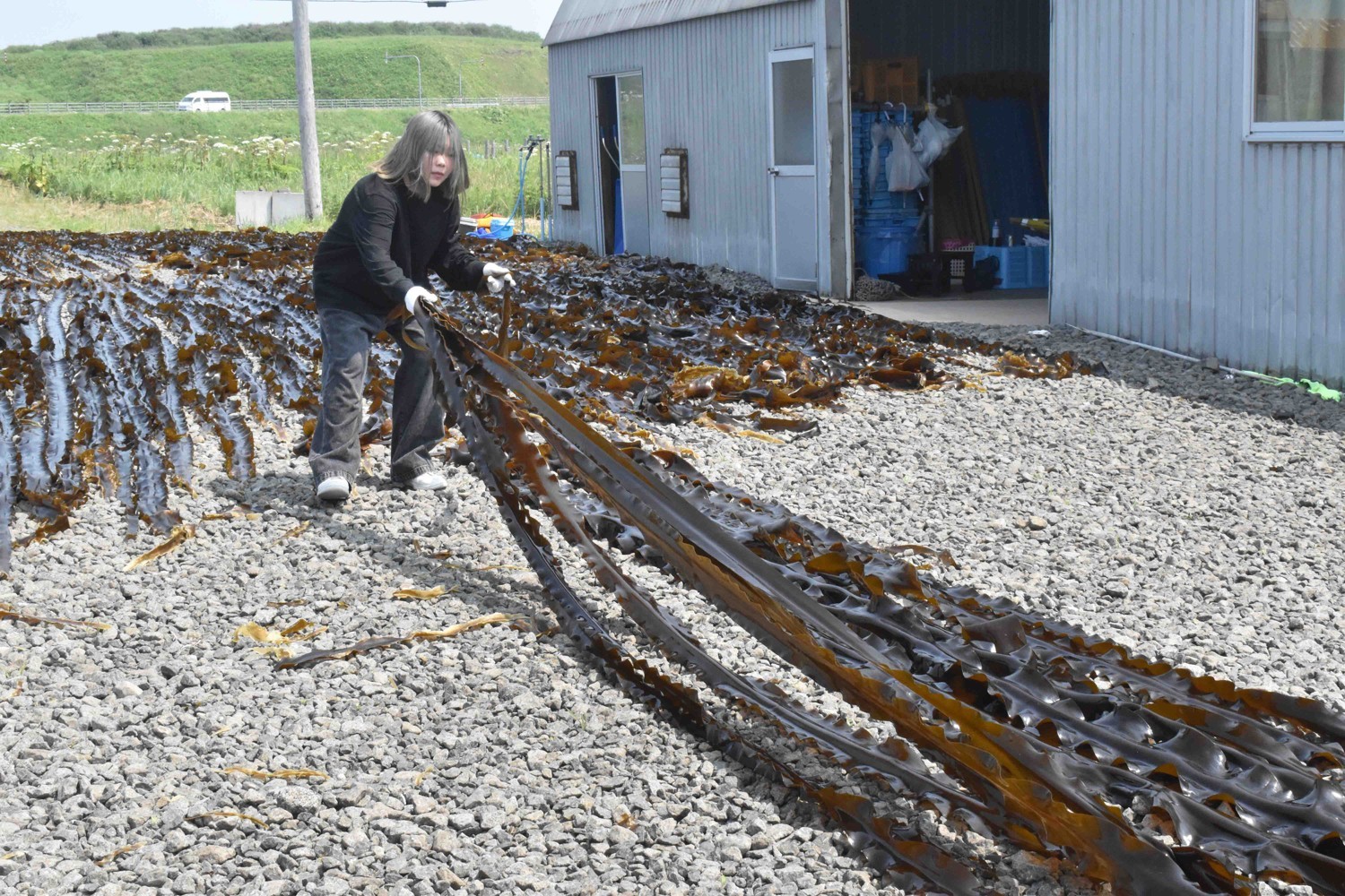 [写真/コンブ干し作業を体験する金子さん]