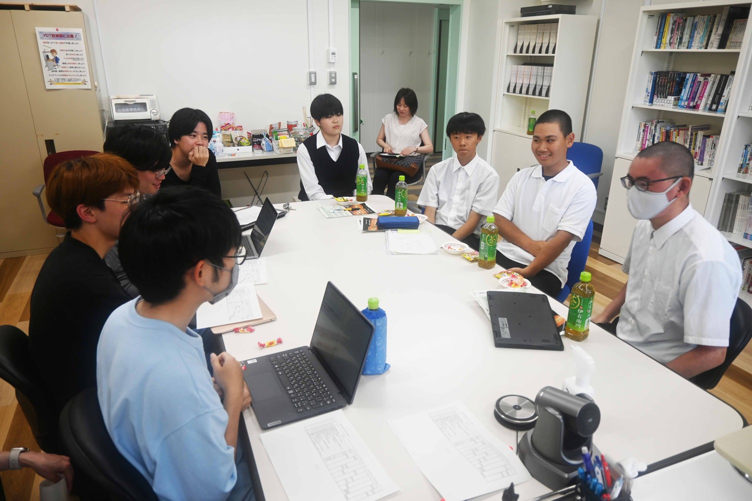 [写真/研究テーマについて意見を交わす学生や生徒ら]