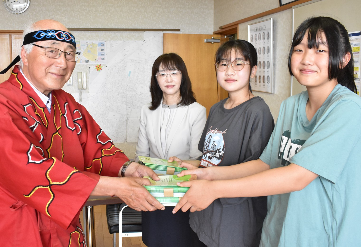 [写真/絵本贈呈式で(左から)竹内さん、田中校長、伊藤さん、梅村さん]