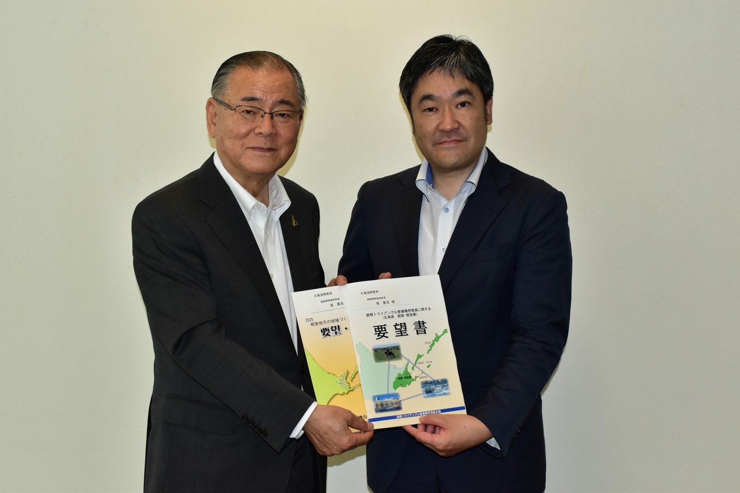 [写真/千島連盟の松本理事長(手前右)から要望書を受け取る佐藤委員長]