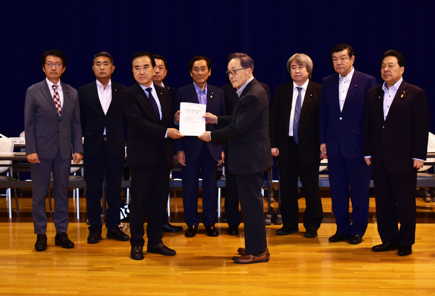 [写真/坂部長に要望書を手渡す石垣市長(左)]