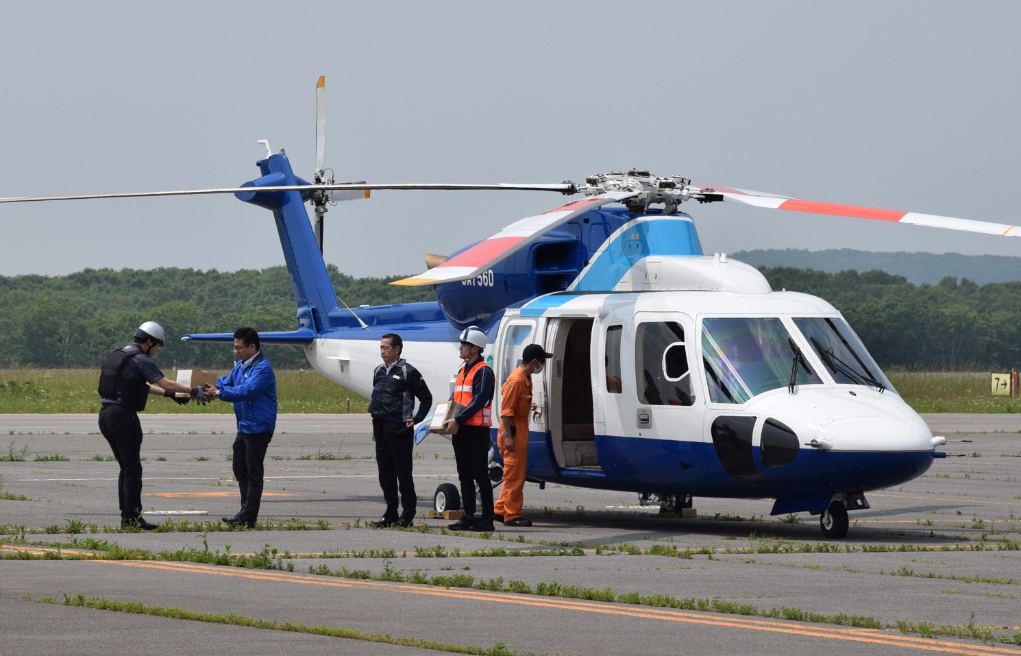 [写真/ヘリで運んできた物資を受け渡す様子]