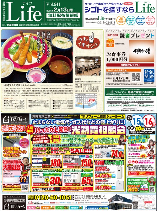 昨年12月19日にオープンした「釧路港」。一品料理からコース料理まであり釧路の海の幸、山の幸を使用した各種料理、釧路のソウルフードを楽しめます。席数は47席あり、これからの時期、歓送迎会や謝恩会などに最適です。また、ランチタイムサービス(日曜日・祝日も休まず営業中)ではお食事されたお客様に河畔駐車場90分無料とワンドリンクをサービス。(河畔駐車場の駐車券をお持ちください)