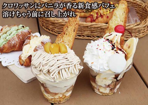 タイヤショップ敷地内に昨年9月、クロワッサンドッグとソフトクリームがイチオシのお持ち帰り専門カフェがオープンしました。今回ご紹介するのは、春の行楽シーズンにぴったりのオリジナルパフェ(全5種類。ほかにカスタード、チョコ、抹茶)が新登場しました。ロイヤルバニラソフトクリームが滲みた自慢のクロワッサンが言葉に出来ないほど好い感じ♪トッピングのクロワッサンラスクも目を引く一品です。タイヤ交換の待ち時間にもどうぞ。