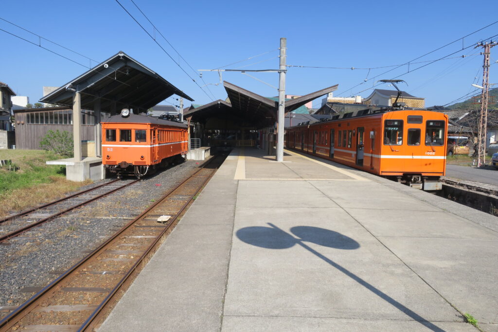 元東急電鉄の1000系(右)と保存車両デハニ50形(出雲大社前)