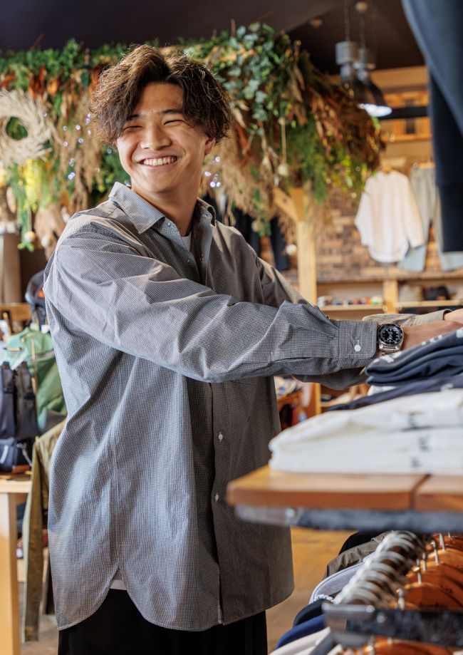 爽やかな笑顔で出迎えてくれた明日見さんは入社2年目でありながら、早くも第2フロアのフロア長に就任したばかり。店で扱うブランドを着こなし、立ち振る舞いもカッコイイ。学生時代には高身長を生かしバレーボールに熱中していたそう。大学では異分野に進み知見を深めたものの、「人と接する仕事に魅力を感じた」というのは、幼いころから家族や店舗スタッフを見てきたからかもしれない。