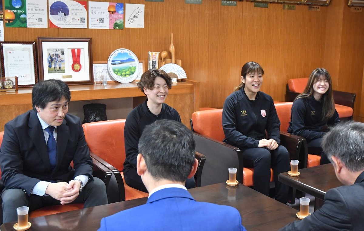 [写真/鶴間市長を表敬訪問した飯塚監督、小池主将、浮田選手、佐藤選手(左から)]