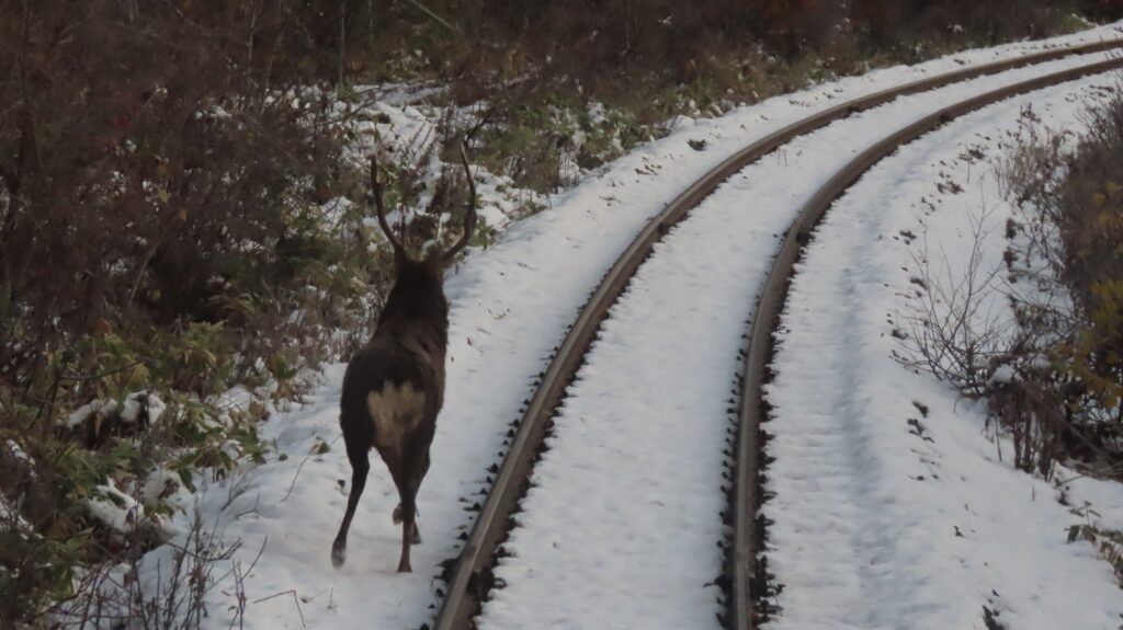 線沿いに逃げる雄のエゾシカ(JR貨物北海道支社提供)
