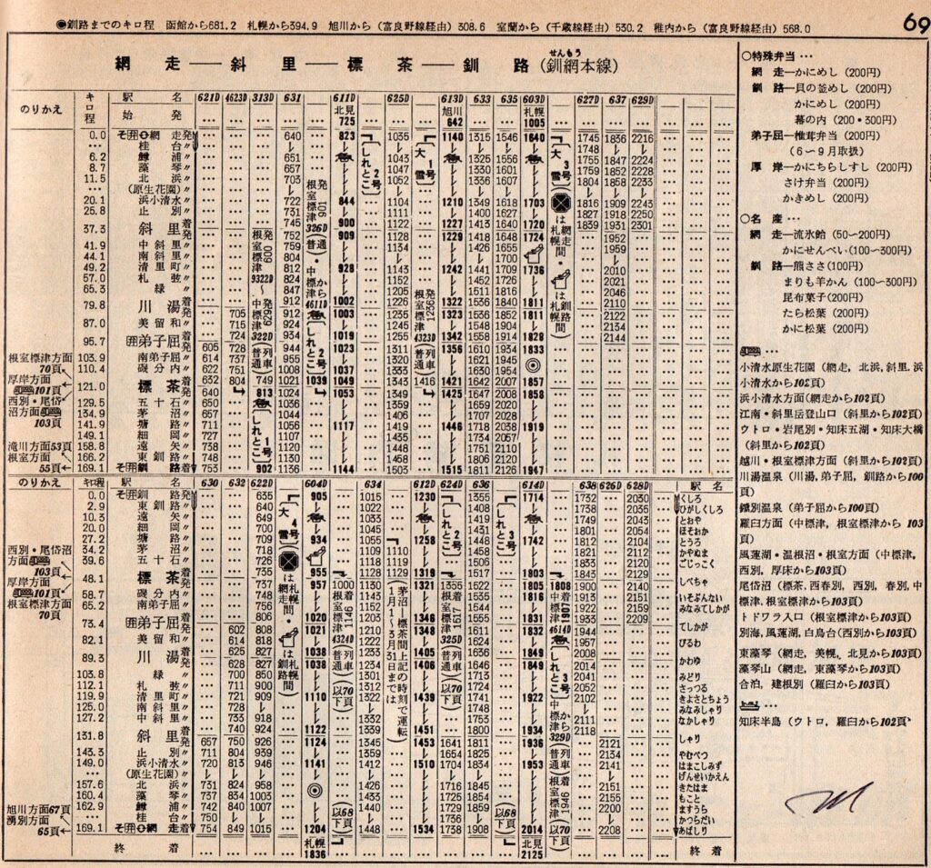 磯分内駅は以前、急行列車が停車していました(1973年3月号「交通公社の北海道時刻表」から)