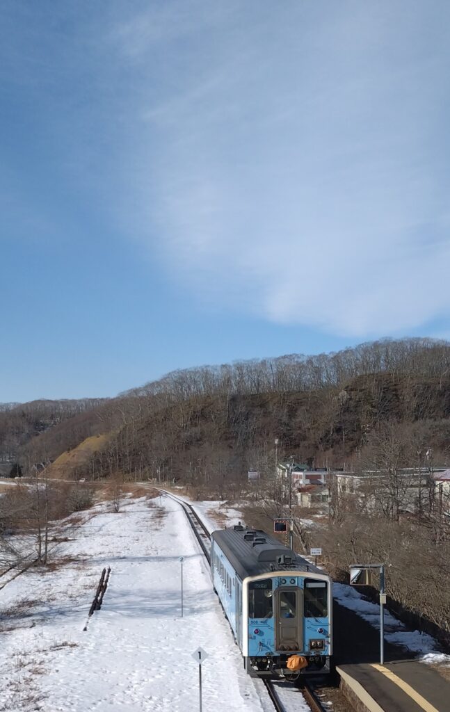 青空の下、別保駅を出発する釧路行キハ54普通列車