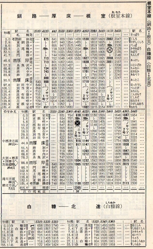 我が家の資料の中に「昭和50年7月改正 釧路鉄道管理局 旅客・荷物輸送取扱方及び客車運用表」があります。その中から「主要旅客列車編成順序」と「新聞郵送列車の指定」、それと参考資料として当時のダイヤがわかる「昭和50年11月 交通公社の北海道時刻表」から釧路、根室関係分を掲載します。見比べてみてください。