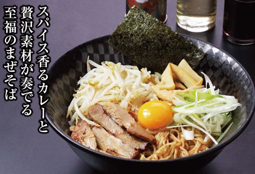 そんな中、今回ご紹介するのはスープ無しで提供する「カレーまぜそば」。自慢の麺に合わせるのは、独自に調合したカレースパイス。魚介を感じる濃厚な旨みと適度な辛みとスパイス感で食欲が進む。卵黄やチャーシューなどを絡めて豪快に味わって頂きたい一杯だ。