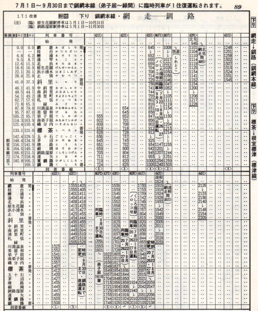 北海道ダイヤ<時刻表>1989年7月1日発行から